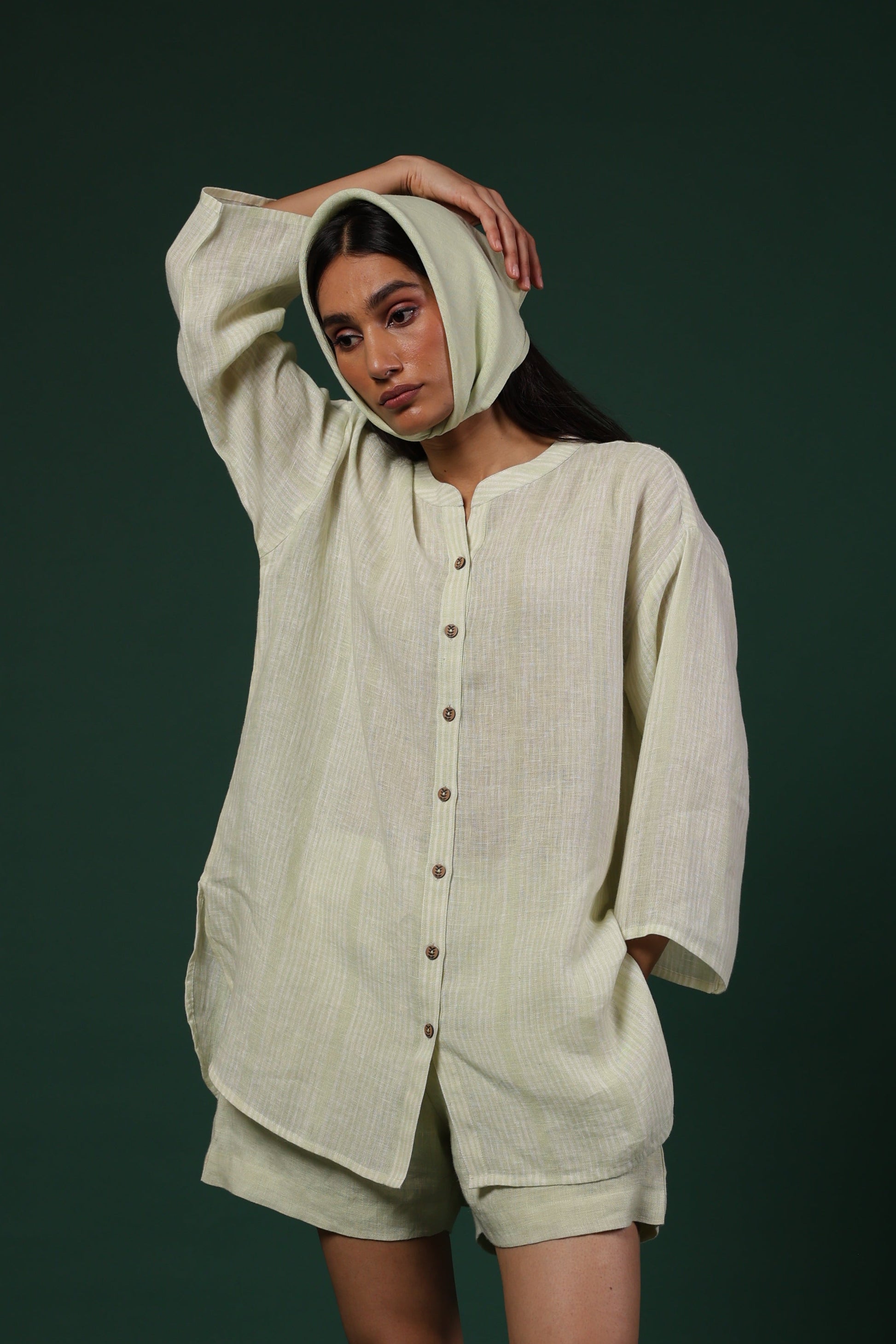 Add comfortable options to your everyday wardrobe with this classic button down shirt. Made from a breathable linen fabric for uninterrupted comfort this oversized shirt comes with a mandarin collar, long sleeves and has wooden buttons to polish off the look.